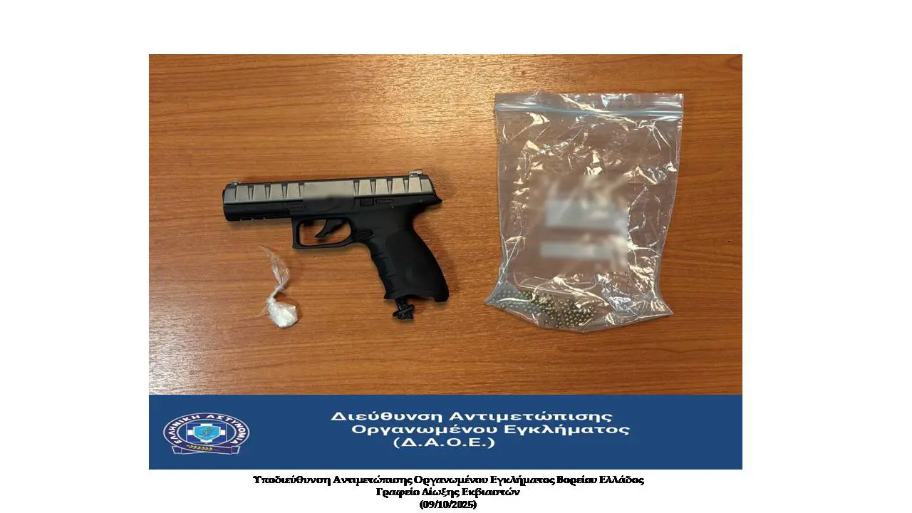Σύμφωνα με την Υποδιεύθυνση Αντιμετώπισης Οργανωμένου Εγκλήματος συνελήφθη βραδινές ώρες της Πέμπτης 9 Οκτωβρίου 2025, σε περιοχή της Θεσσαλονίκης, 36χρονος αλλοδαπός, ο οποίος κατηγορείται για παραβάσεις των νομοθεσιών για τα ναρκωτικά και τα όπλα.