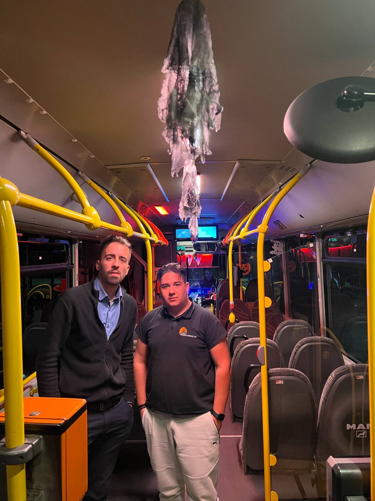 «Πλέον μας έχουν μάθει και περιμένουν από εμάς τον στολισμό», λέει, μιλώντας στο ΑΠΕ-ΜΠΕ, και όπως μπορεί να διαπιστώσει κανείς από τις εικόνες, έδωσε πάλι τον καλύτερό του εαυτό και μετέφερε το Halloween στο εσωτερικό του λεωφορείου.