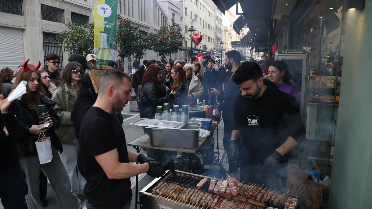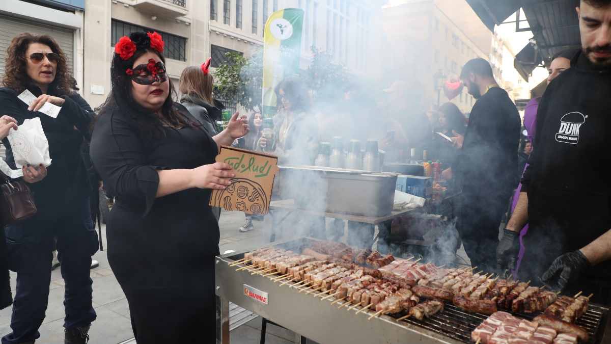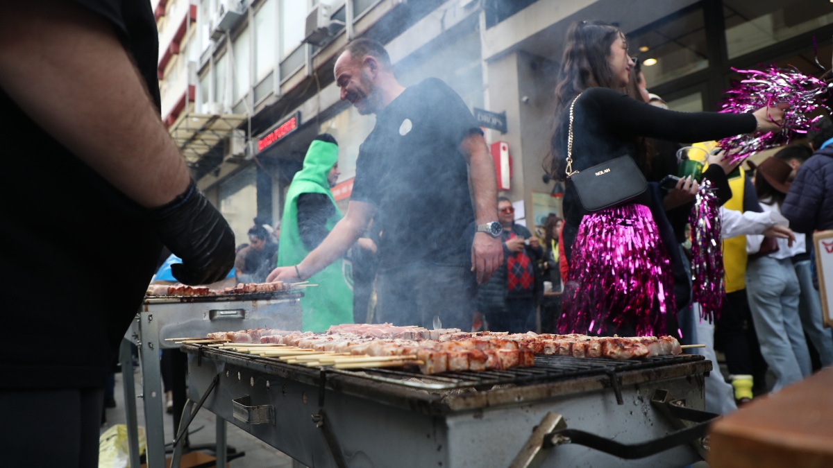 Έντονη είναι η μυρωδιά της «τσίκνας» σε όλο το κέντρο καθώς, ψησταριές με τα παραδοσιακά σουβλάκια της ημέρας έχουν στηθεί σε δεκάδες σημεία.