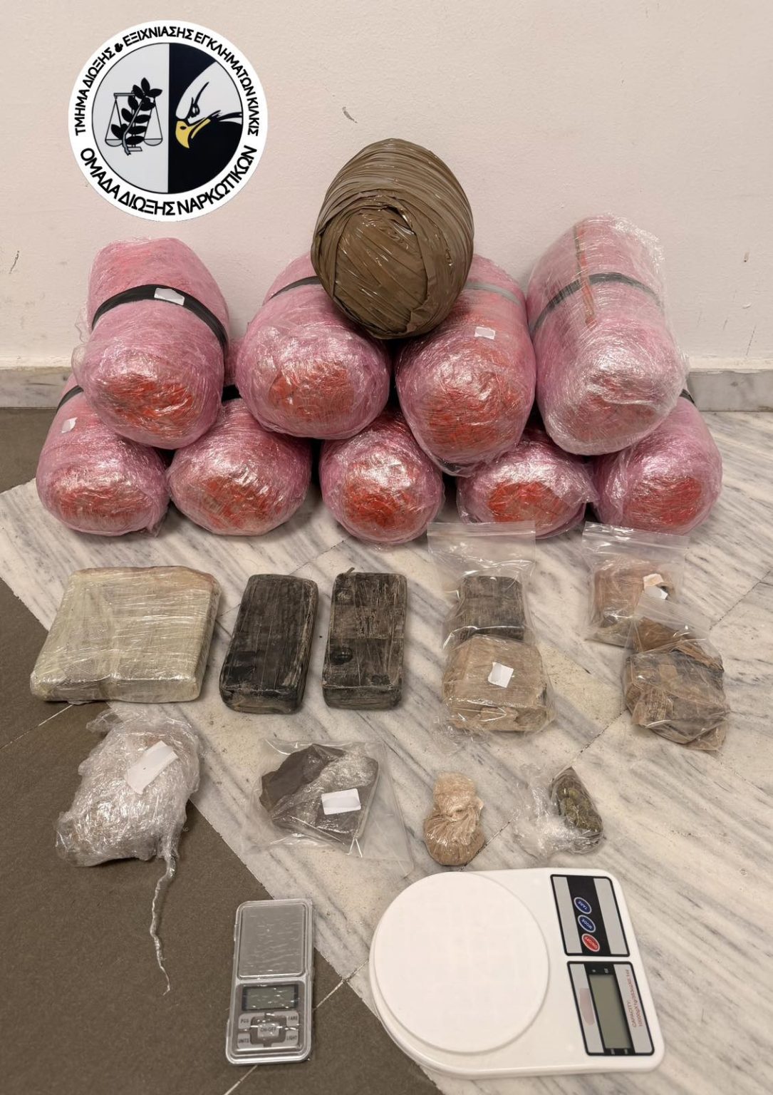Σε έρευνα που έγινε στο σπίτι του, με τη συνδρομή του αστυνομικού σκύλου «Vector», κατασχέθηκαν 11 κιλά ακατέργαστης κάνναβης, 2 κιλά ηρωίνης, 1 κιλό κατεργασμένης κάνναβης, δύο ζυγαριές ακριβείας και κινητά τηλέφωνα.