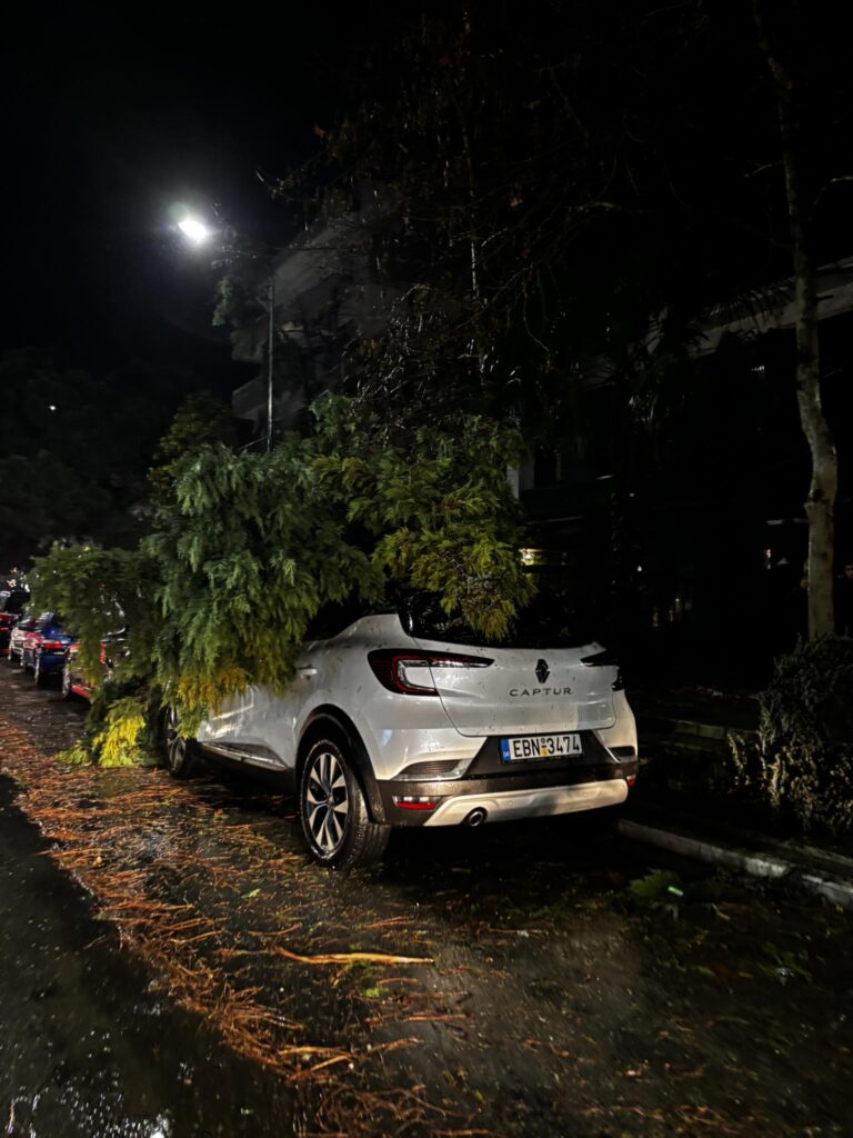 Κάτοικοι και διερχόμενοι περιέγραφαν εικόνες δρόμων που μετατράπηκαν σε χείμαρρους, ενώ σε πολλά σημεία της πόλης οι άνεμοι ξερίζωσαν δέντρα και τα έριξαν πάνω σε σταθμευμένα αυτοκίνητα.