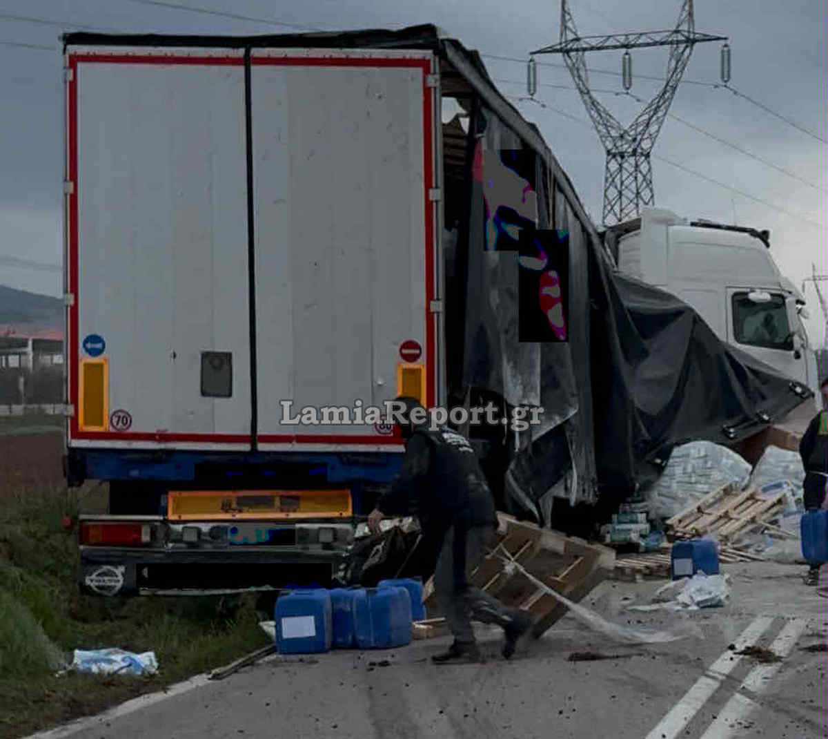 Συγκεκριμένα, νταλίκα φορτωμένη με τσιμέντα και ορυκτά έλαια, για άγνωστη αιτία, εξετράπη της πορείας της με αποτέλεσμα να γεμίσει ο δρόμος με μέρος του φορτίου της.