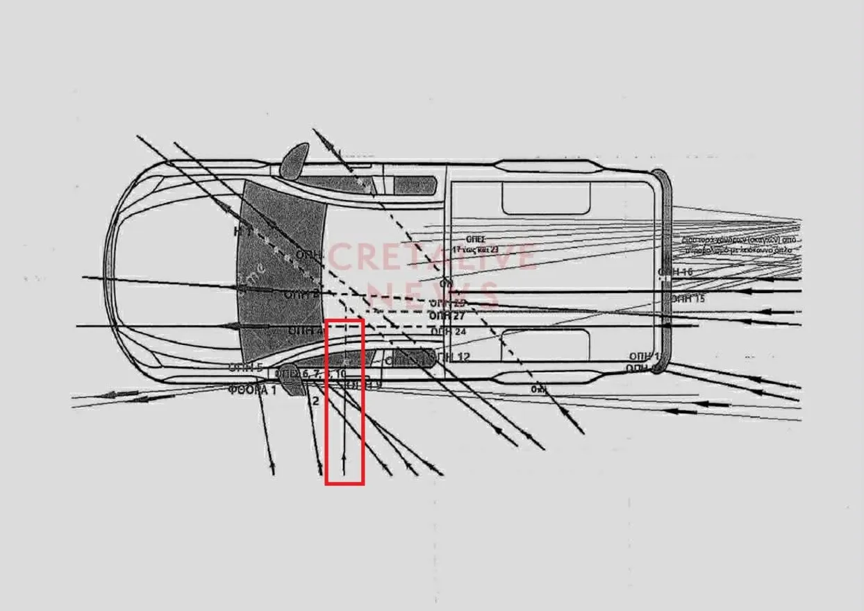 Πάντως, το τεχνικό διάγραμμα της βλητικής διερεύνησης της Διεύθυνσης Εγκληματολογικών Ερευνών που αποτυπώνει την κατεύθυνση των βολών στο όχημα, κατά την κρίσιμη χρονική στιγμή, είναι αποκαλυπτικό.