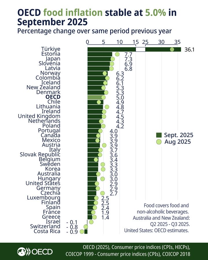 Σύμφωνα με τα τελευταία στοιχεία του ΟΟΣΑ για τον Σεπτέμβριο 2025, ο πληθωρισμός στα τρόφιμα στη χώρα μας διαμορφώθηκε στο 1,4%, έναντι 3,5% στον μέσο όρο της ΕΕ και 5% στις χώρες του ΟΟΣΑ.
