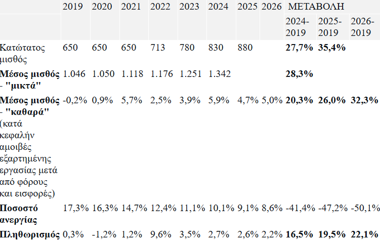 - για τα λεφτά που μπαίνουν «στην τσέπη» από την άλλη, ενώ οι καθαρές μέσες αποδοχές των εργαζομένων στη χώρα αυξήθηκαν από το 2019 ως το 2025 κατά 26%, το 2026 η αύξηση θα φτάνει σε 32,3%. Από το 2024 και μετά οι αυξήσεις δείχνουν να «τρέχουν» σταθερά με ρυθμούς περίπου 5%-6% .