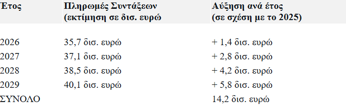 Για τους απόμαχους της εργασίας, αντίστοιχα, το κονδύλι των συντάξεων προβλέπεται να ανεβαίνει κάθε χρόνο κατά περίπου 1,4 – 1,6 δισ. ευρώ. Η συνταξιοδοτική δαπάνη αναμένεται να αυξηθεί από 34,3 δισ. ευρώ το 2025, στα 40,1 δισ. ευρώ ως το 2029.