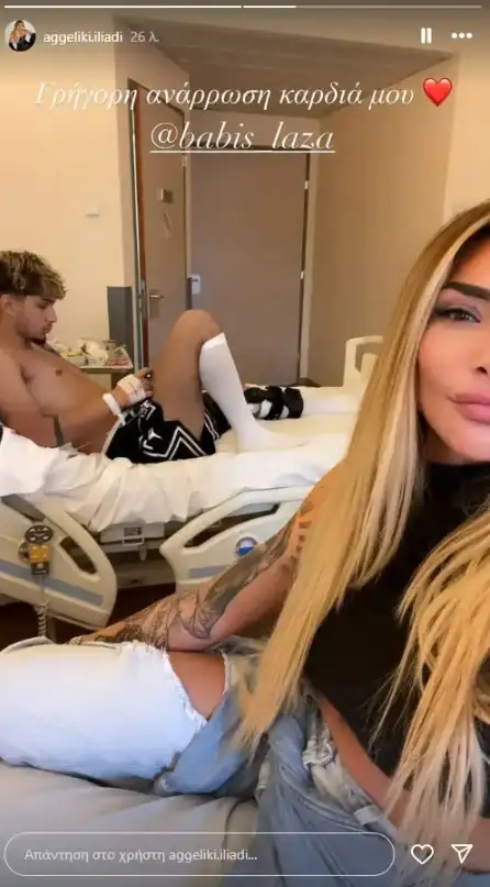 Παρόλο που η Αγγελική Ηλιάδη εκθέτει σπάνια προσωπικά οικογενειακά ζητήματα, ανάρτησε την πρώτη φωτογραφία από το νοσοκομείο, στην οποία ποζάρει με φόντο τον γιο της. Ο Μπάμπης διακρίνεται στο βάθος, με το δεμένο πόδι του να μαρτυρά την πρόσφατη επέμβαση στην οποία υποβλήθηκε την Παρασκευή (10/10).