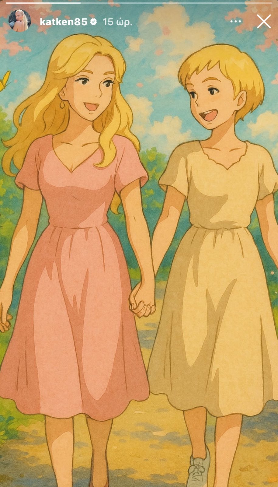 Αντί για λέξεις, η Κατερίνα Καινούργιου δημοσίευσε μια εικόνα στην οποία η ίδια και η εκλιπούσα φίλη της απεικονίζονται σε μορφή καρτούν, να περπατούν πιασμένες χέρι-χέρι. Η εικόνα αυτή, χωρίς κανένα σχόλιο, λέει πολλά περισσότερα από χίλιες λέξεις, αποτυπώνοντας τον αδιάσπαστο δεσμό που τις ένωνε.