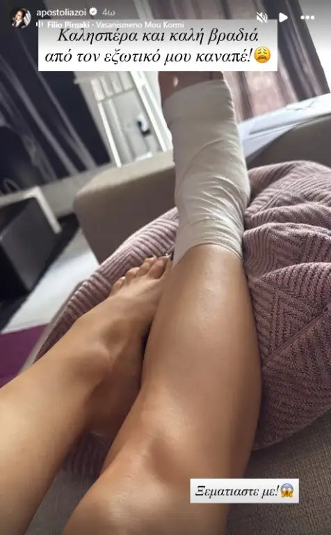 «Καλησπέρα και καλή βραδιά από τον εξωτικό μου καναπέ», έγραψε η Αποστολία Ζώη σε ένα story στο Instagram, δείχνοντας το πόδι της που ήταν δεμένο.