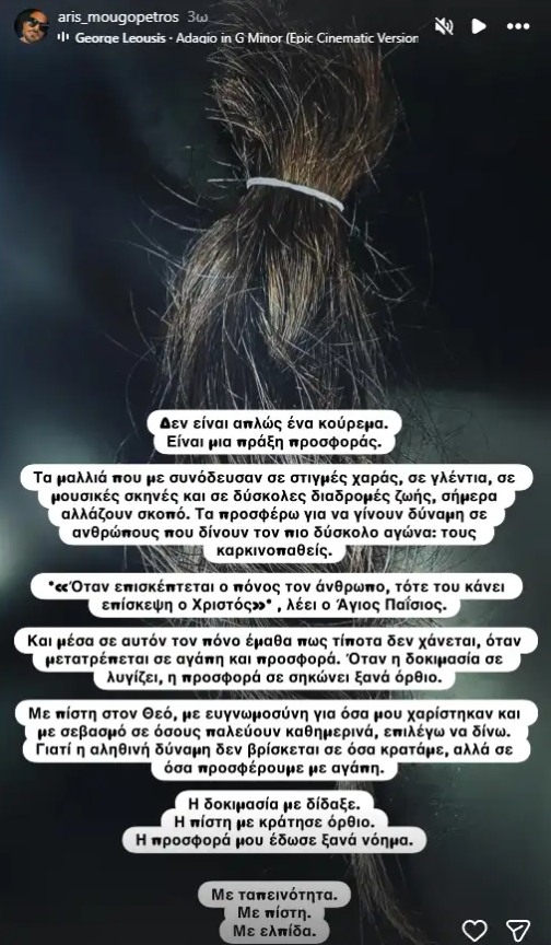 «Δεν είναι απλώς ένα κούρεμα. Είναι μια πράξη προσφοράς. Τα μαλλιά που με συνόδευσαν σε στιγμές χαράς, σε γλέντια, σε μουσικές σκηνές και σε δύσκολες διαδρομές ζωής, σήμερα αλλάζουν σκοπό. Τα προσφέρω για να γίνουν δύναμη σε ανθρώπους που δίνουν τον πιο δύσκολο αγώνα: τους καρκινοπαθείς.