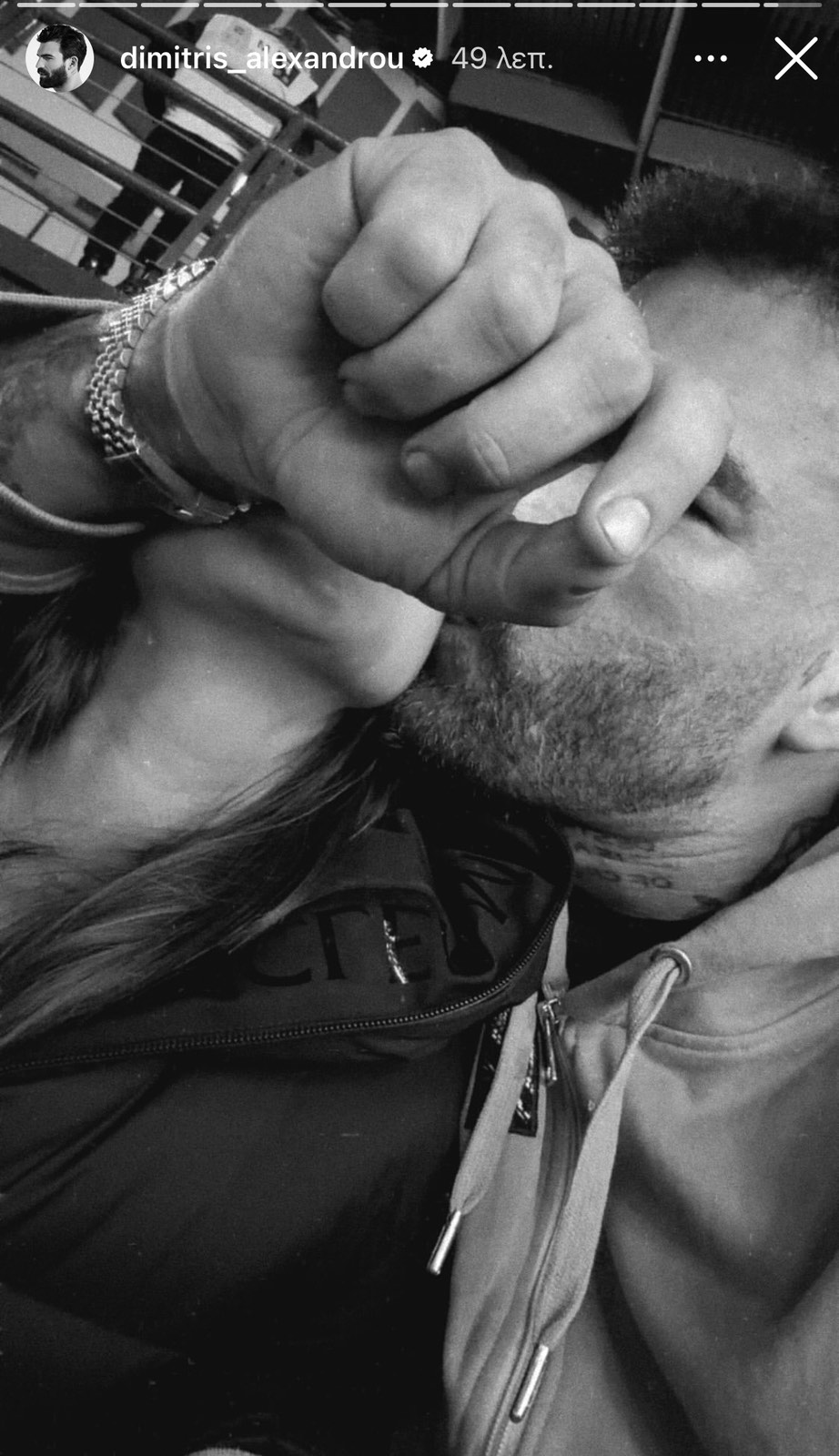 Στη φωτογραφία αυτή τους βλέπουμε να ανταλλάσουν ένα τρυφερό φιλί, όμως ο Δημήτρης Αλεξάνδρου προτίμησε να μην αποκαλύψει τα πάντα, καλύπτοντας το πρόσωπο της συντρόφου του.