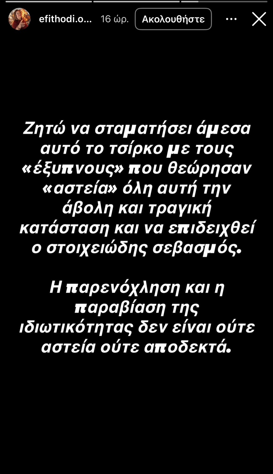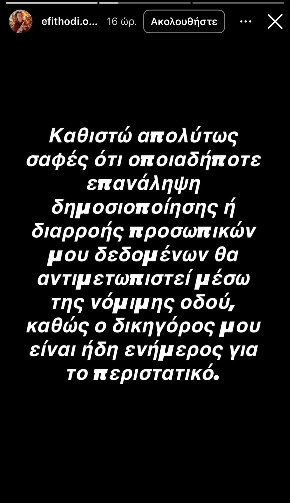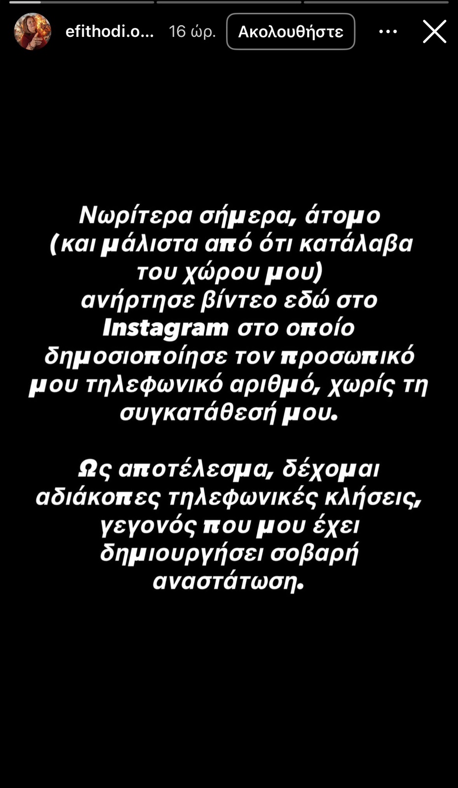«Νωρίτερα σήμερα, άτομο (και μάλιστα από ότι κατάλαβα του χώρου μου) ανήρτησε βίντεο εδώ στο Instagram στο οποίο δημοσιοποίησε τον προσωπικό μου τηλεφωνικό αριθμό, χωρίς τη συγκατάθεσή μου. Ως αποτέλεσμα, δέχομαι αδιάκοπες τηλεφωνικές κλήσεις, γεγονός που μου έχει προκαλέσει σοβαρή αναστάτωση.