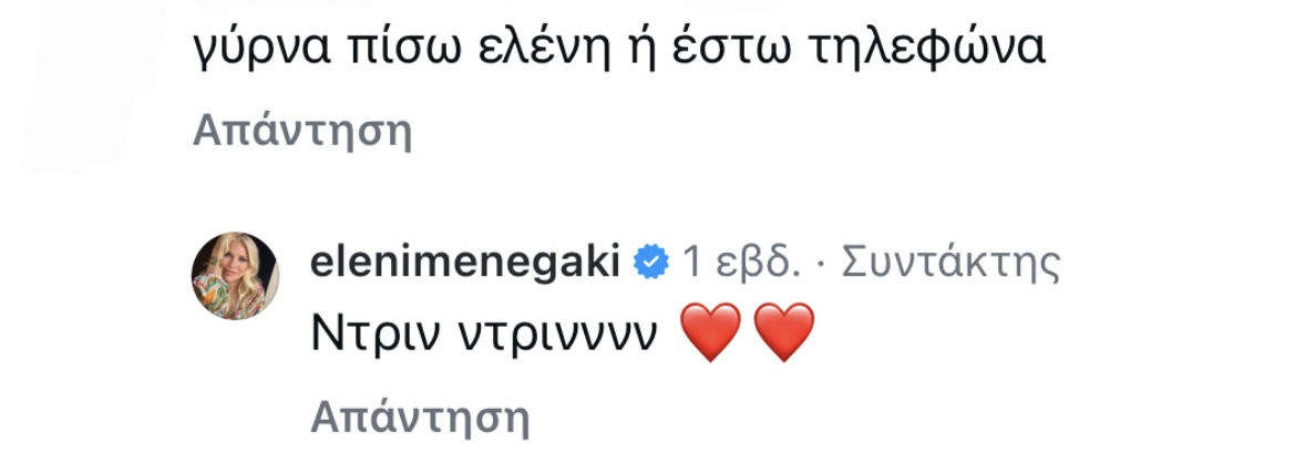 Η απάντηση της Ελένης Μενεγάκη δεν άργησε να έρθει, καθώς η παρουσιάστρια σχολίασε με νόημα «Ντριν ντρινννν», μια ατάκα που αμέσως προκάλεσε αίσθηση στους θαυμαστές της.