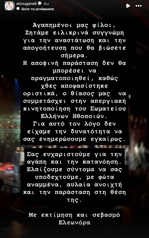 Την απόφαση των συντελεστών να συμμετέχουν στην 24ωρη απεργία του ΣΕΗ έκανε γνωστή η Ελεωνόρα Ζουγανέλη μέσω ανάρτησης της στα social media.