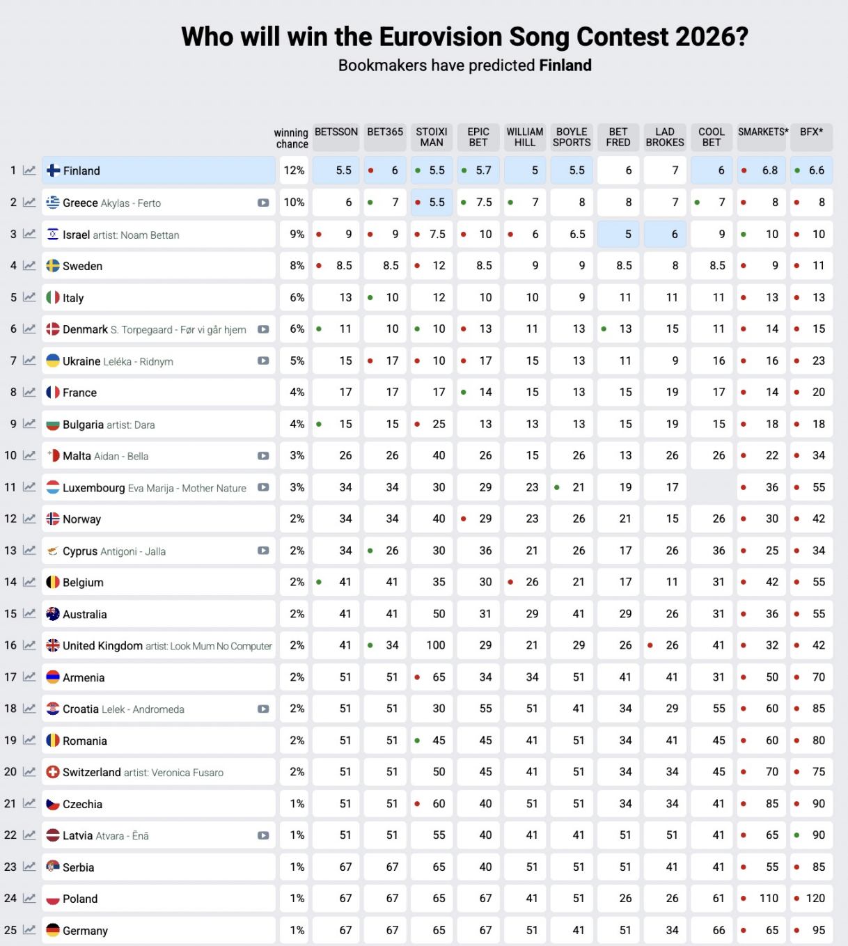 Από την ώρα που έγινε γνωστή η συμμετοχή του Akyla στα ημιτελικά του Eurovision – Sing for Greece 2026 η Ελλάδα πήρε την άνοδο στα στοιχήματα για τον μουσικό διαγωνισμό στη Βιέννη φτάνοντας μέχρι σήμερα στην 2η θέση στην οποία σκαρφάλωσε όπως φαίνεται στον παρακάτω πίνακα.