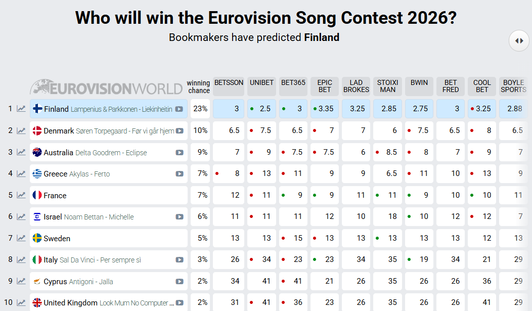 Αν και η Φινλανδία παραμένει το ακλόνητο φαβορί για τη νίκη, η ιστορία του διαγωνισμού έχει δείξει ότι οι μεγάλες ανατροπές συμβαίνουν συνήθως κατά τη διάρκεια των προβών και της ζωντανής παρουσίασης στη σκηνή.