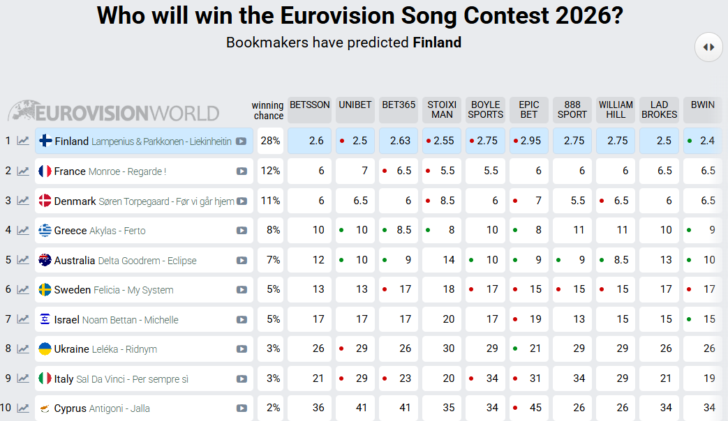 Eurovision 2026: Η Ελλάδα σταθερά στην τετράδα των στοιχημάτων – Ποια είναι τα μεγάλα φαβορί