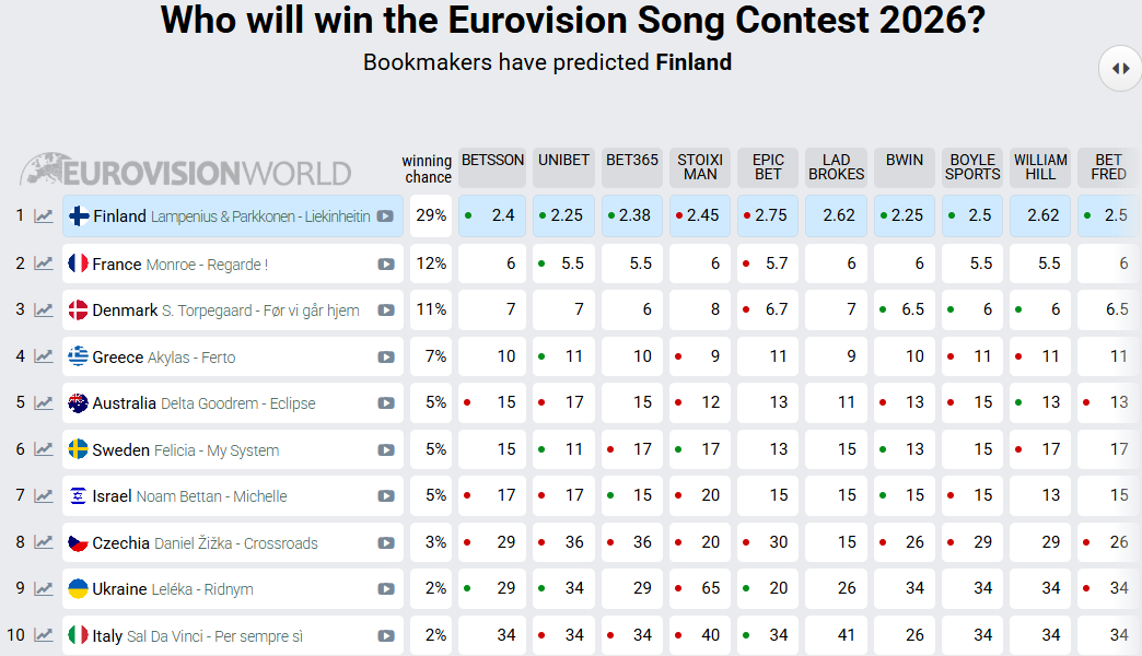 Στην κορυφή των στοιχημάτων η Φινλανδία φαίνεται να έχει «κλειδώσει» την πρωτιά με 29%, ενώ η Γαλλία και η Δανία ακολουθούν με 12% και 11% αντίστοιχα.