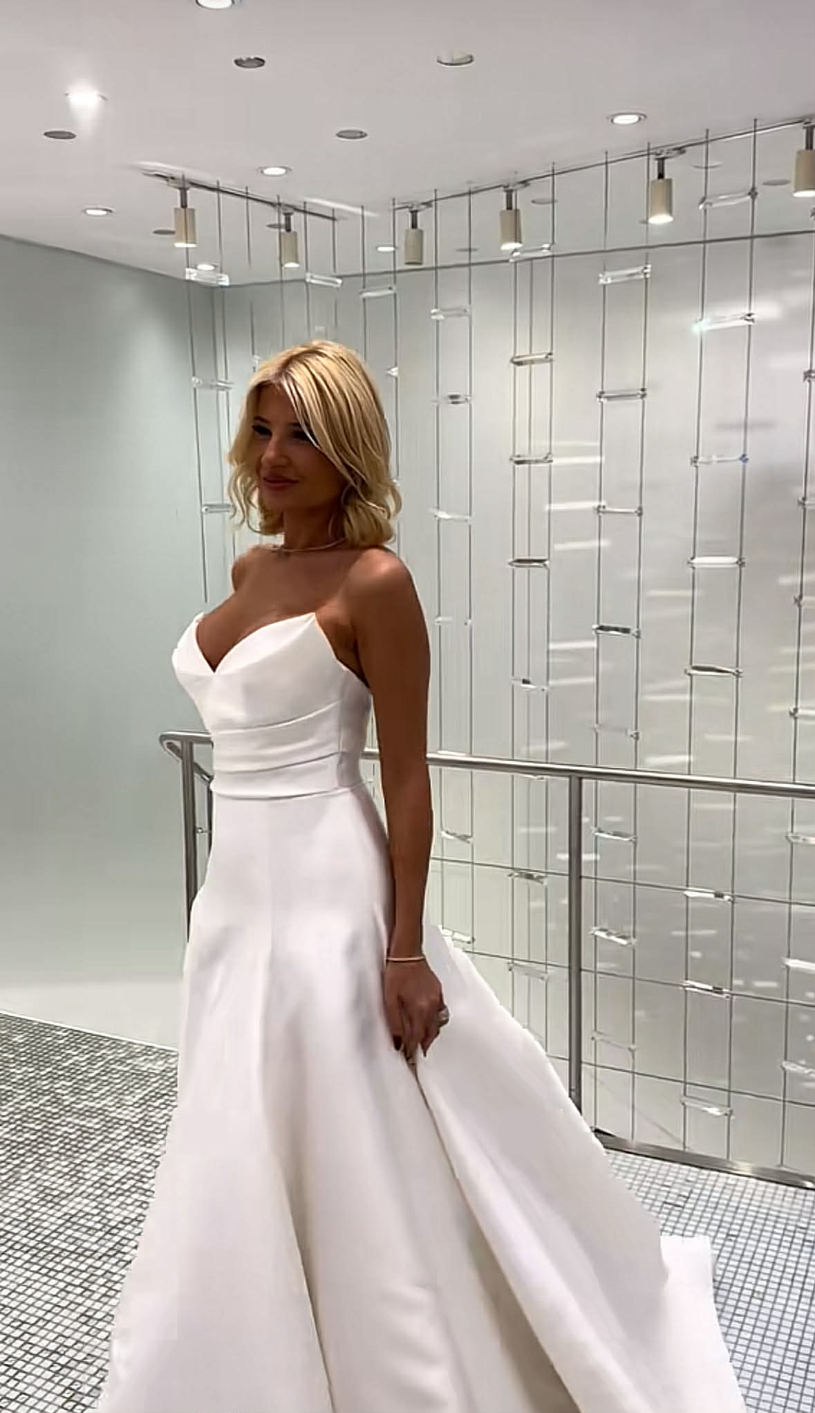 Στο συγκεκριμένο βίντεο, η Φαίη Σκορδά ποζάρει φορώντας ένα εκπληκτικό λευκό νυφικό με στράπλες μπούστο που αναδεικνύει τέλεια τη σιλουέτα της.