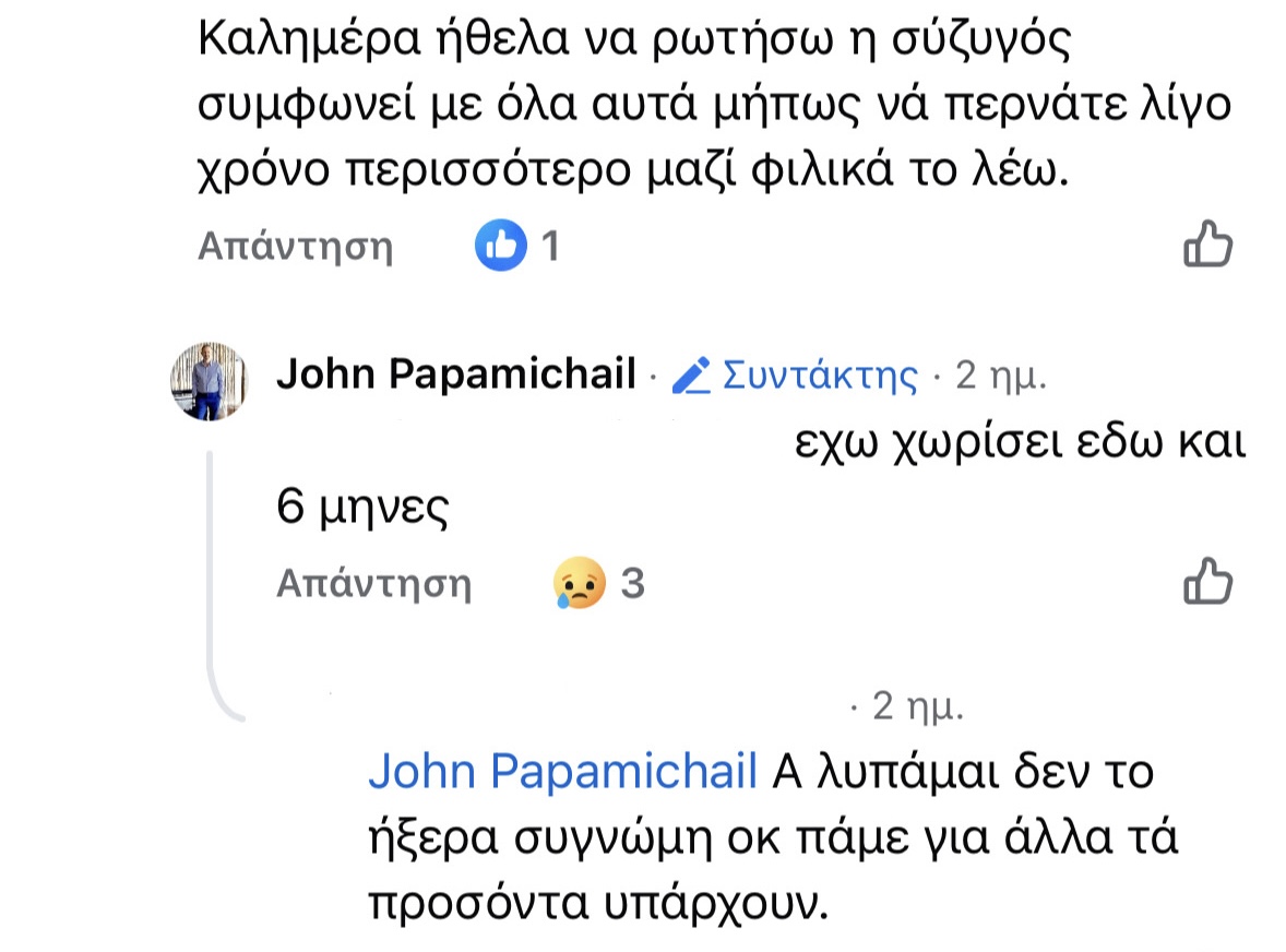 Συγκεκριμένα, η αφορμή δόθηκε από το σχόλιο ενός ακόλουθου στο Facebook, ο οποίος κάτω από μια ανάρτηση του Γιάννη Παπαμιχαήλ αναρωτήθηκε: «Η σύζυγος συμφωνεί με όλα αυτά; Μήπως να περνάτε λίγο περισσότερο χρόνο μαζί;».
