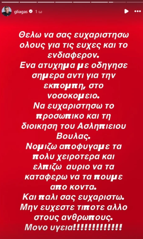«Θέλω να σας ευχαριστήσω όλους για τις ευχές και το ενδιαφέρον. Ένα ατύχημα με οδήγησε σήμερα αντί για την εκπομπή στο νοσοκομείο. Να ευχαριστήσω το προσωπικό και τη διοίκηση του Ασκληπιού Βούλας. Νομίζω αποφύγαμε τα πολύ χειρότερα και ελπίζω αύριο να τα καταφέρω να τα πούμε από κοντά. Και πάλι σας ευχαριστώ. Μην εύχεστε τίποτα άλλο στους ανθρώπους. Μόνο υγεία!», ανέφερε χαρακτηριστικά στη λεζάντα της ανάρτησής του.