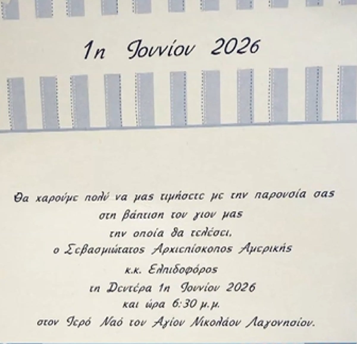 Σύμφωνα με το ρεπορτάζ, τα πρώτα προσκλητήρια έχουν ήδη σταλεί σε στενούς φίλους και συγγενείς του ζευγαριού. Η βάφτιση θα πραγματοποιηθεί τη Δευτέρα 1η Ιουνίου 2026, στις 18:30 το απόγευμα, στον Ιερό Ναό του Αγίου Νικολάου στο Λαγονήσι.