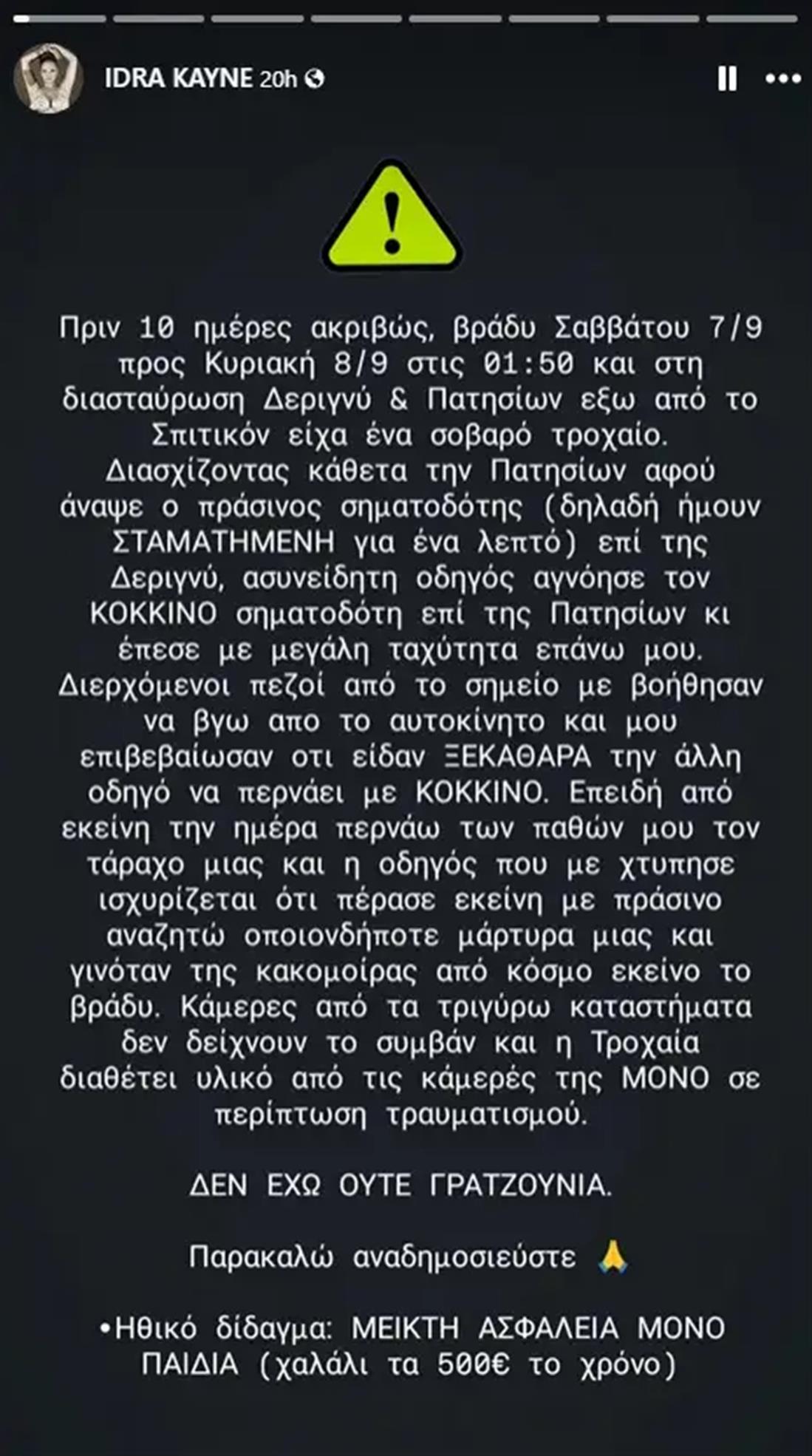 Κάμερες από τα τριγύρω καταστήματα δεν δείχνουν το συμβάν και η Τροχαία διαθέτει υλικό από τις κάμερές της μόνο σε περίπτωση τραυματισμού. Δεν έχω ούτε γρατζουνιά. Παρακαλώ αναδημοσιεύστε. Ηθικό δίδαγμα: μεικτή ασφάλεια μόνο, παιδιά (χαλάλι τα 500 ευρώ τον χρόνο)», έγραψε η Idra Kayne.