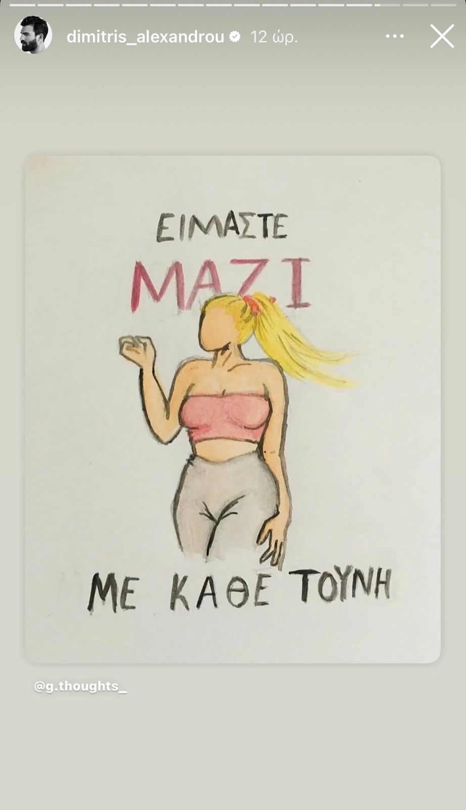 «Είμαστε μαζί με κάθε Τούνη» γράφει η εικόνα που αναδημοσίευσε ο Δημήτρης Αλεξάνδρου στον προσωπικό του λογαριασμό στο Instagram.