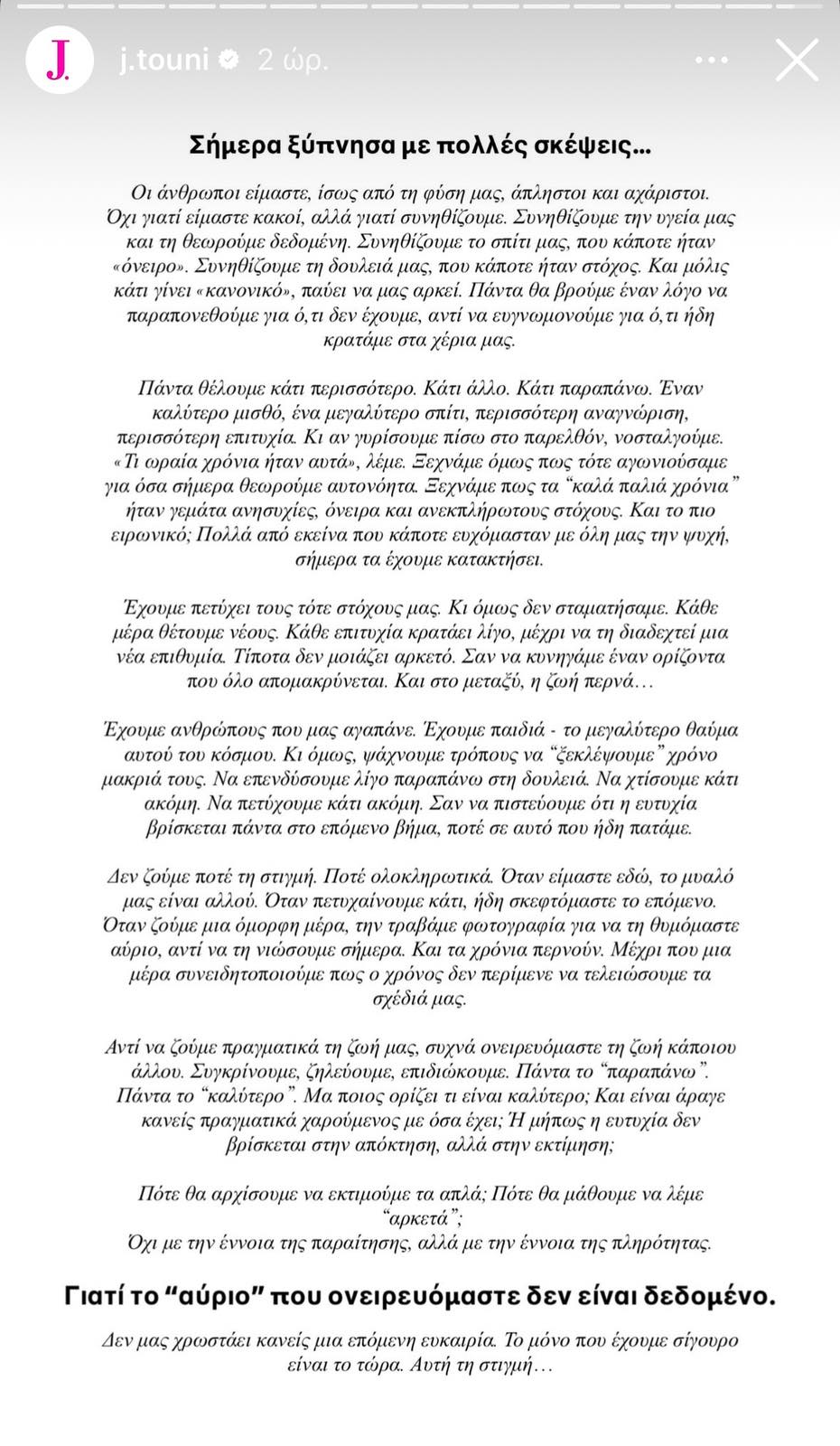 «Σήμερα ξύπνησα με πολλές σκέψεις… Οι άνθρωποι είμαστε, ίσως από τη φύση μας, άπληστοι και αχάριστοι. Όχι γιατί είμαστε κακοί, αλλά γιατί συνηθίζουμε. Συνηθίζουμε την υγεία μας και τη θεωρούμε δεδομένη. Συνηθίζουμε το σπίτι μας, που κάποτε ήταν «όνειρο». Συνηθίζουμε τη δουλειά μας, που κάποτε ήταν στόχος. Και μόλις κάτι γίνει «κανονικό», παύει να μας αρκεί. Πάντα θα βρούμε έναν λόγο να παραπονιόμαστε για ό,τι δεν έχουμε, αντί να ευγνωμονούμε για ό,τι ήδη κρατάμε στα χέρια μας.