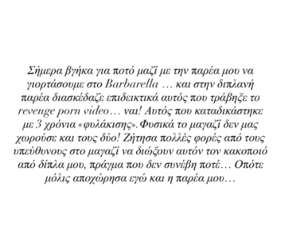 Σε ανάρτησή της στα social media, η Ιωάννα Τούνη περιέγραψε την κατάσταση: «Στη διπλανή παρέα διασκέδαζε επιδεικτικά αυτός που τράβηξε το revenge porn βίντεο… Ζήτησα πολλές φορές από τους υπεύθυνους να τον απομακρύνουν, πράγμα που δε συνέβη ποτέ, οπότε αποχώρησα μαζί με την παρέα μου».