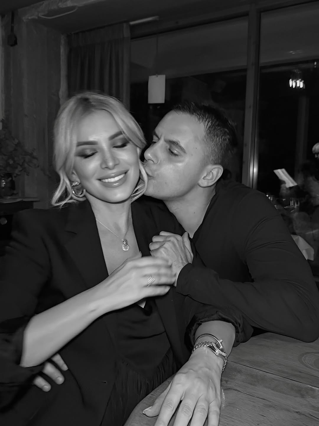 Στην τρυφερή εικόνα, ο Παναγιώτης Κουτσουμπής φαίνεται να σκύβει και να δίνει ένα γλυκό φιλί στην παρουσιάστρια, ενώ εκείνη χαμογελά ακτινοβολώντας ευτυχία στο πλευρό του.