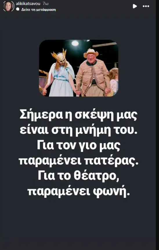 «Σήμερα η σκέψη μας είναι στη μνήμη του. Για τον γιο μας παραμένει πατέρας. Για το θέατρο παραμένει φωνή».