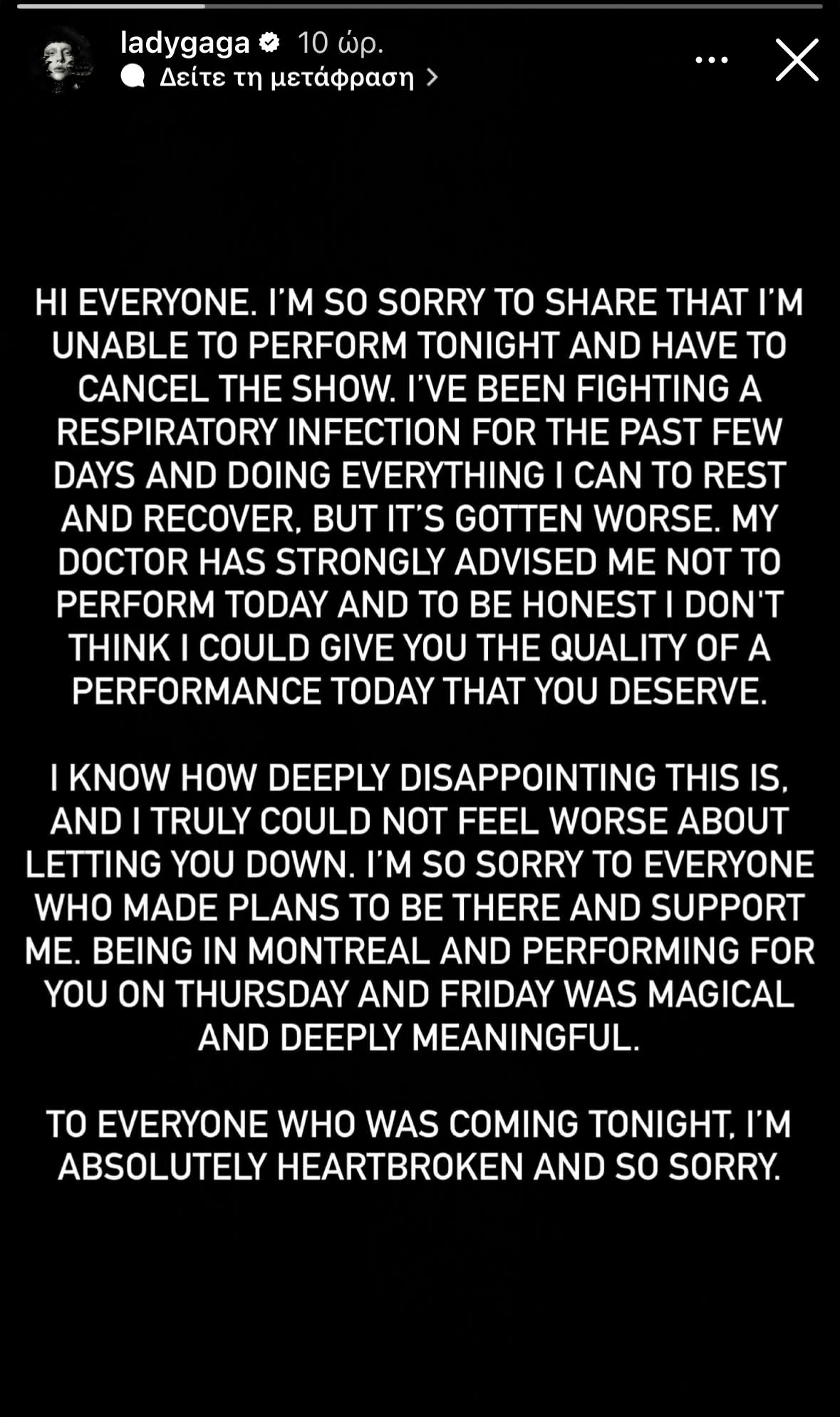 Ζητώ ειλικρινά συγγνώμη από όλους όσοι είχατε κανονίσει να έρθετε και να με στηρίξετε. Το να βρίσκομαι στο Μόντρεαλ και να τραγουδώ για εσάς την Πέμπτη και την Παρασκευή ήταν μαγικό και πολύ σημαντικό για μένα. Σε όλους όσοι θα έρχονταν απόψε, είμαι συντετριμμένη και λυπάμαι πάρα πολύ» έγραψε η Lady Gaga.