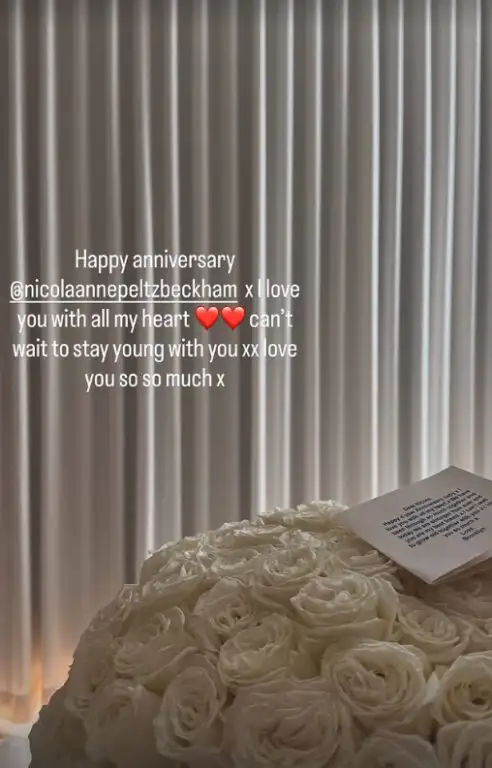 «Χαρούμενη επέτειο Νίκολα Πελτζ, σε αγαπώ με όλη μου την καρδιά… ανυπομονώ να μείνουμε νέοι μαζί. Σε αγαπώ τόσο, τόσο πολύ» έγραψε στο μήνυμα με το οποίο συνόδευσε την ανάρτησή του ο γιος της Βικτόρια και του Ντέιβιντ Μπέκαμ.