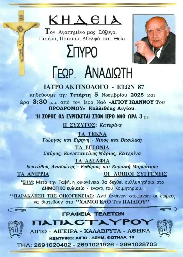 Η εξόδιος ακολουθία του Σπύρου Αναδιώτη θα τελεστεί σήμερα, Τετάρτη 5 Νοεμβρίου 2025, στις 3:30 το μεσημέρι, στον Ιερό Ναό Αγίου Ιωάννου του Προδρόμου, στην Καλλιθέα Αιγίου.