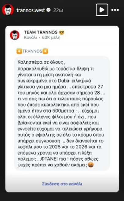 Στην κατάσταση που επικρατεί στο Ντουμπάι στάθηκε με ανάρτησή του στον προσωπικό του λογαριασμό στο Instagram ο Trannos.
