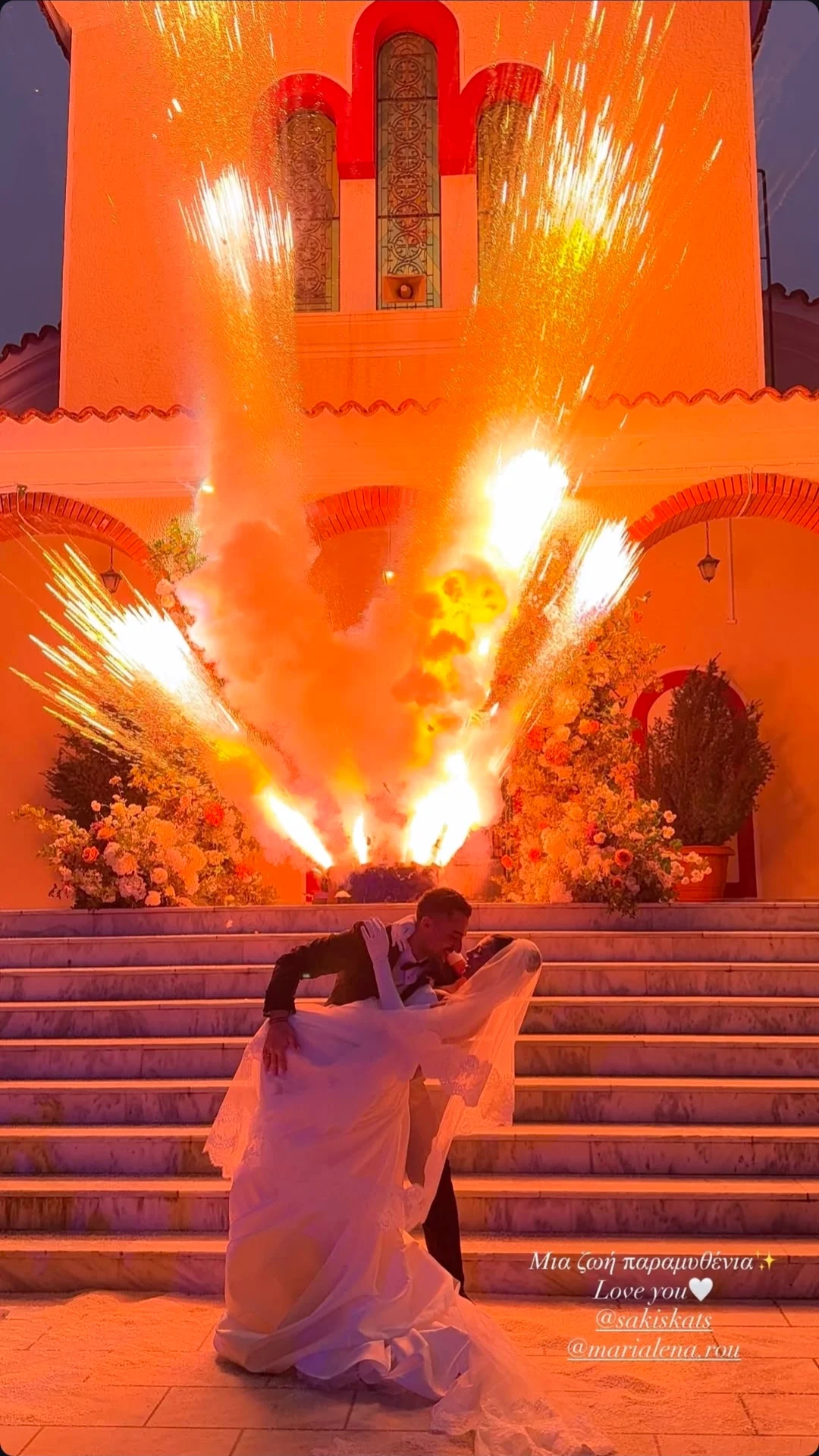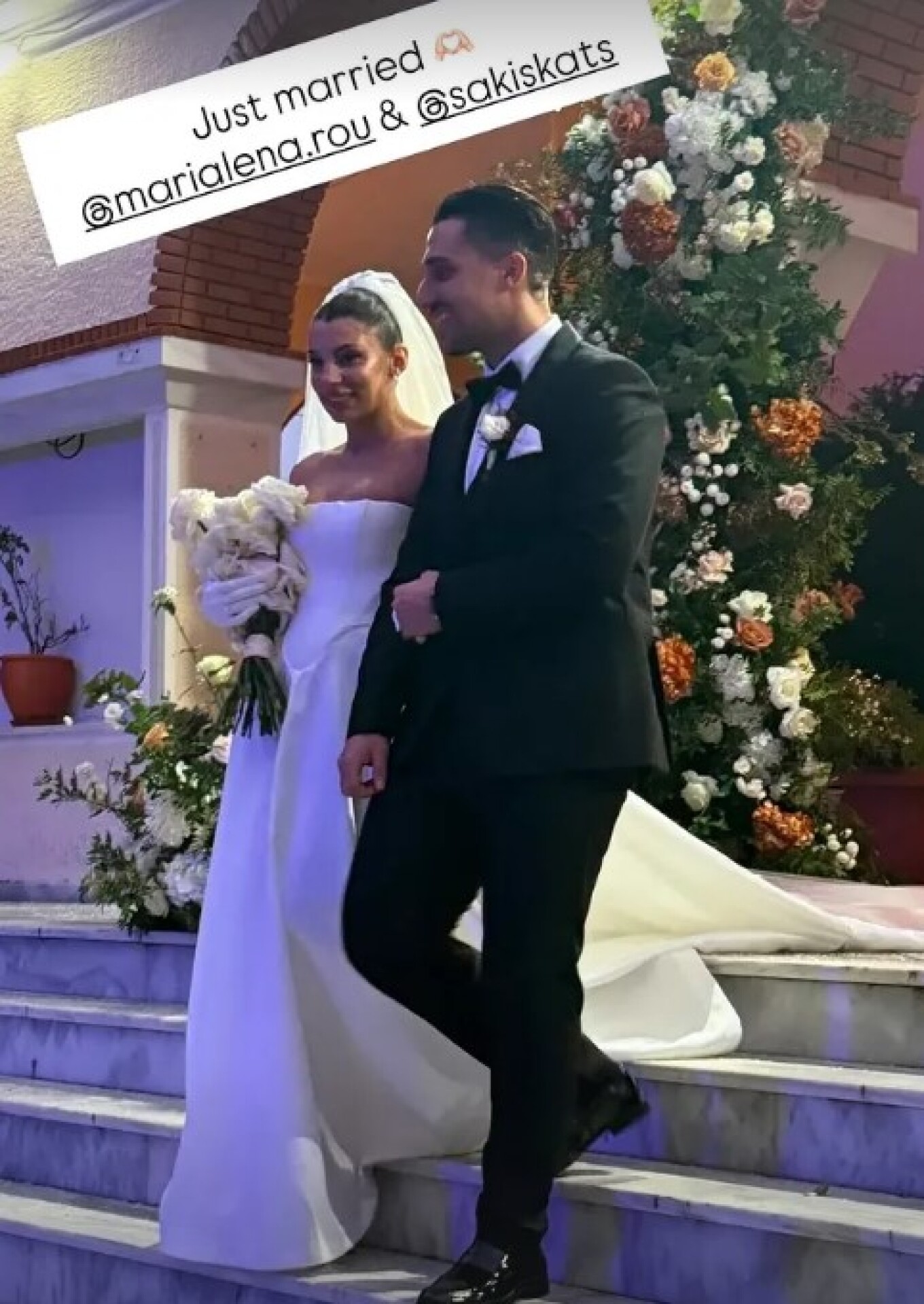 Η Μαριαλένα Ρουμελιώτη εντυπωσίασε μέσα στο λευκό νυφικό της με το μακρύ πέπλο, ενώ ο Σάκης επέλεξε ένα κλασικό μαύρο κοστούμι για την πιο σημαντική στιγμή της ζωής τους.