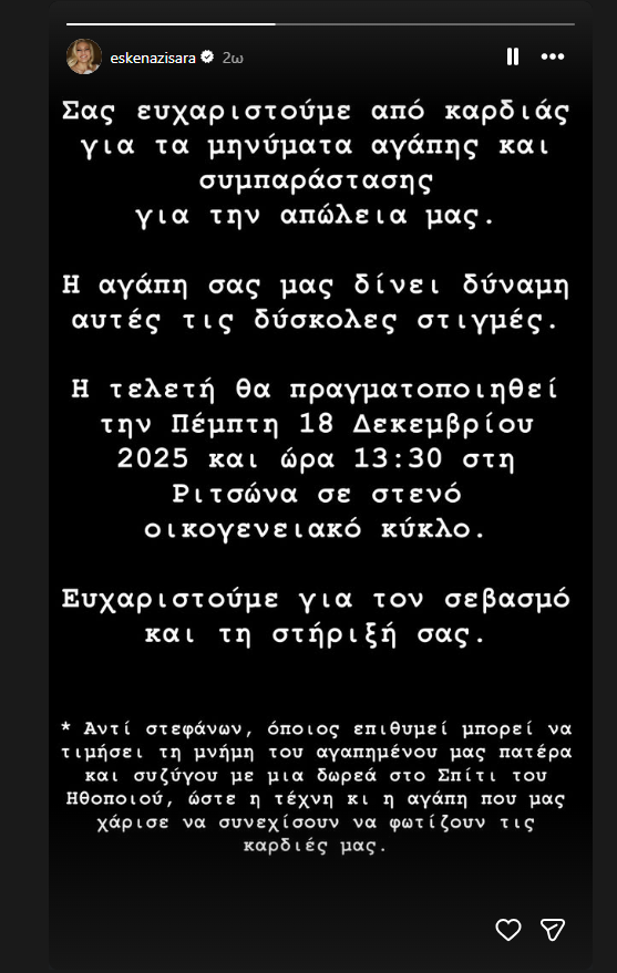«Σας ευχαριστούμε από καρδιάς για τα μηνύματα αγάπης και συμπαράστασης για την απώλειά μας. Η αγάπη σας μας δίνει δύναμη αυτές τις δύσκολες στιγμές» ανέφερε αρχικά για να προσθέσει: «Η τελετή θα πραγματοποιηθεί την Πέμπτη 18 Δεκεμβρίου 2025 και ώρα 13:30 στη Ριτσώνα σε στενό οικογενειακό κύκλο. Ευχαριστούμε για τον σεβασμό και τη στήριξή σας».