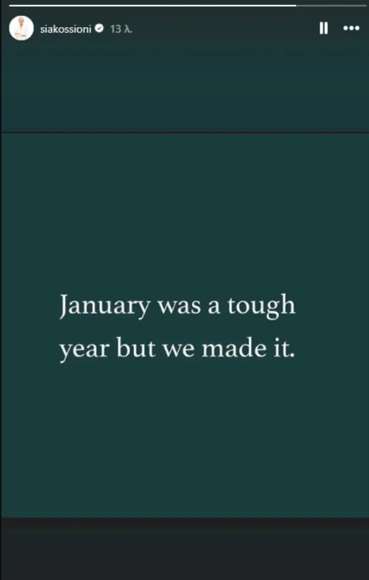 Στην ανάρτηση που έκανε σήμερα (01.02), η Σία Κοσιώνη αναφέρθηκε στην περιπέτεια υγείας της, γράφοντας: «Ο Ιανουάριος ήταν μία δύσκολη χρονιά, αλλά τα καταφέραμε». Η αρχική ανησυχία των οικείων της έχει δώσει τη θέση της στην ανακούφιση, καθώς η πορεία της είναι σταθερά ανοδική.