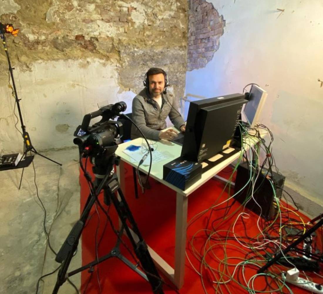 Στις φωτογραφίες που δημοσιεύτηκαν από τον επίσημο λογαριασμό της Eurovision στην Ουκρανία στο Instagram, ο Τιμούρ Μιροσνιτσένκο φαίνεται να κάθεται σε ένα μικρό γραφείο περιτριγυρισμένο από μια κάμερα, φώτα και πολλά καλώδια.