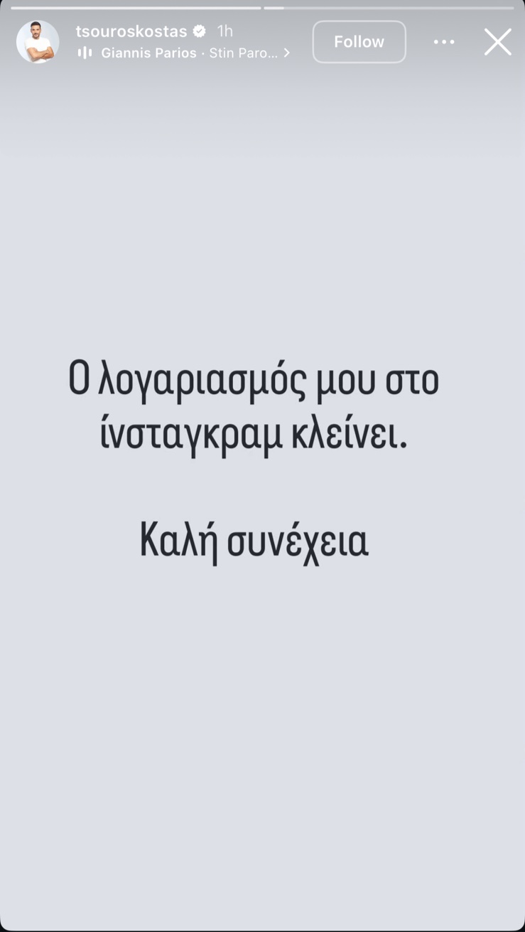 Συγκεκριμένα ο Κώστας Τσουρός έγραψε: «Ο λογαριασμός μου στο ίνσταγκραμ κλείνει. Καλή συνέχεια». Σημειώνεται ότι δεν έχει αναφέρει τους λόγους τους οποίους τον οδήγησαν να πάρει αυτή την απόφαση.