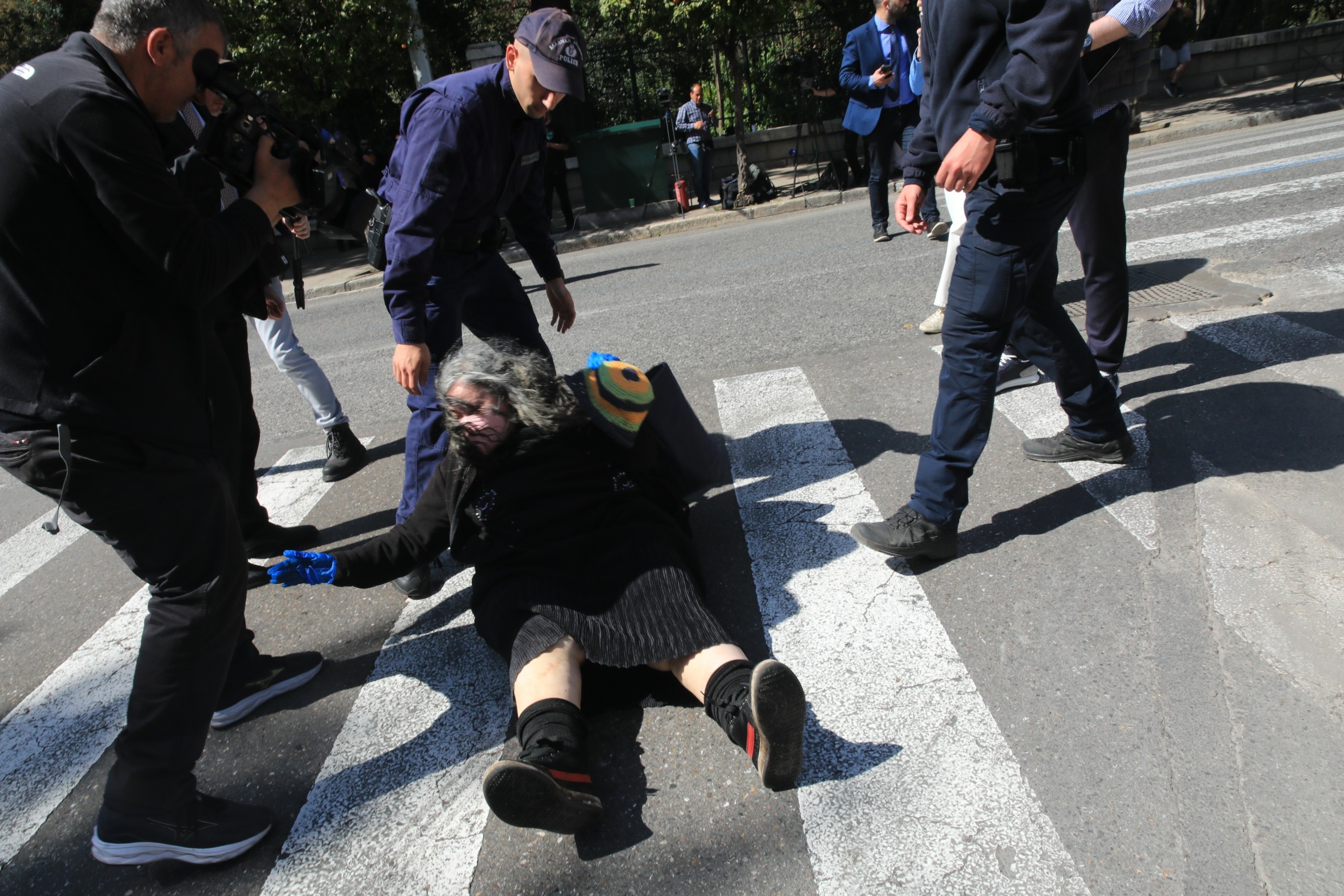 Η κ. Λουκά φώναζε συνθήματα για την τραγωδία των Τεμπών, αλλά και το γάμο των ομόφυλων ζευγαριών με αποδέκτη τον Κυριάκο Μητσοτάκη, ξάπλωσε στο έδαφος και άρχισε να εξαπολύει ύβρεις προς όλους.