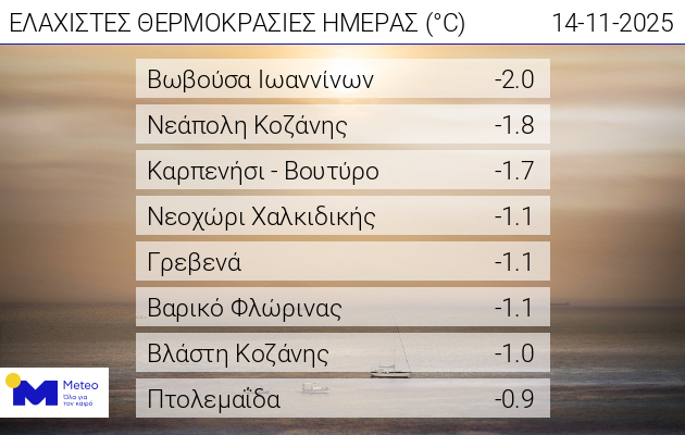 Οι 8 σταθμοί με τις χαμηλότερες τιμές θερμοκρασίας μεταξύ των σταθμών του δικτύου του meteo.gr