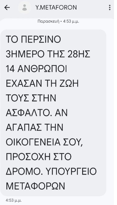 Το μήνυμα έγραφε: «Το περσινό 3ήμερο της 28ης 14 άνθρωποι έχασαν τη ζωή τους στην άσφαλτο. Αν αγαπάς την οικογένειά σου, προσοχή στο δρόμο. Υπουργείο Μεταφορών».