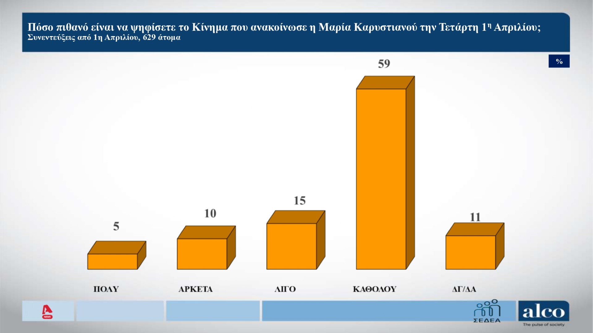 Τα αποτελέσματα του πρώτου μέρους της δημοσκόπησης της εταιρείας Alco παρουσιάστηκαν το απόγευμα της Μ. Δευτέρας (06.04) στο κεντρικό δελτίο ειδήσεων του Alpha.