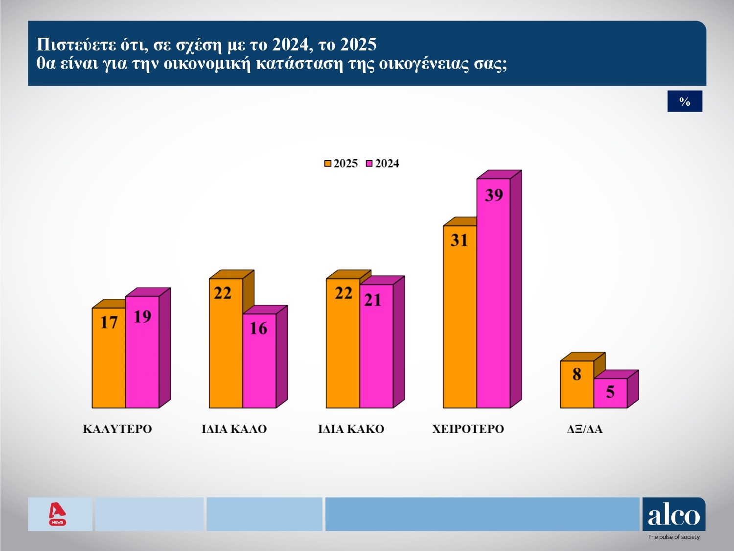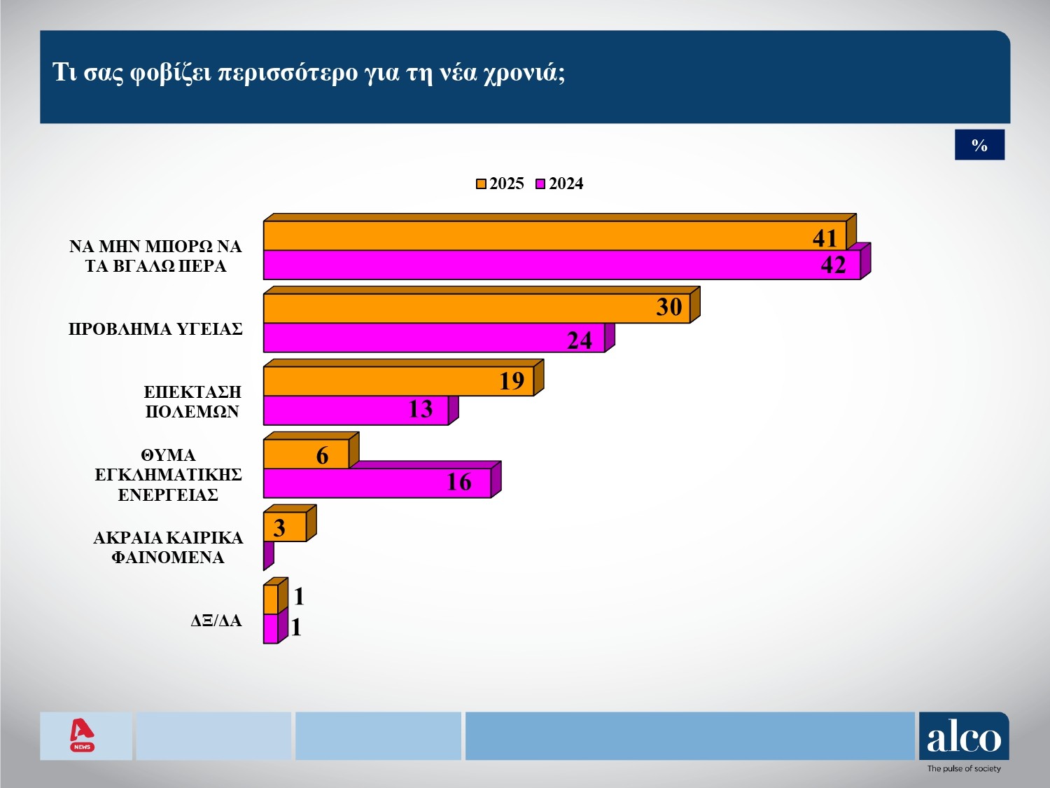 Σε ερώτηση της δημοσκόπησης ποια θα θέλατε να είναι η προτεραιότητα της κυβέρνησης για το 2025 το 47% απαντά η ακρίβειας. Το 25% ζητά βελτιώσεις στο ΕΣΥ και ακολουθεί η μείωση της φορολογίας με 9%.