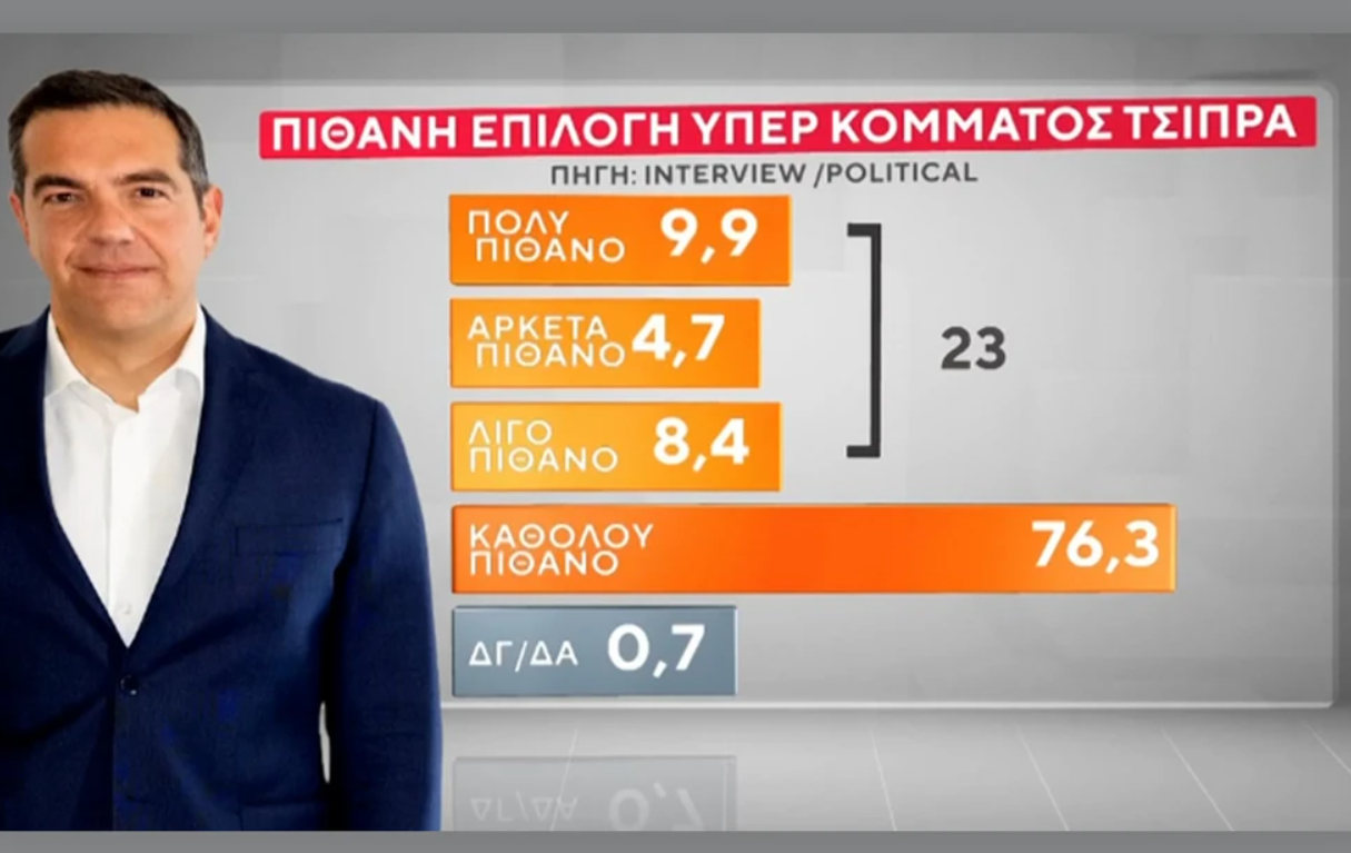 Αντίστοιχα, στο ενδεχόμενο δημιουργίας ή ηγεσίας κόμματος από τον Αλέξη Τσίπρα, το 9,9% απαντά ότι είναι «πολύ πιθανό» να το ψηφίσει, το 4,7% «αρκετά πιθανό», το 8,4% «λίγο πιθανό», ενώ το 76,3% δηλώνει «καθόλου πιθανό».