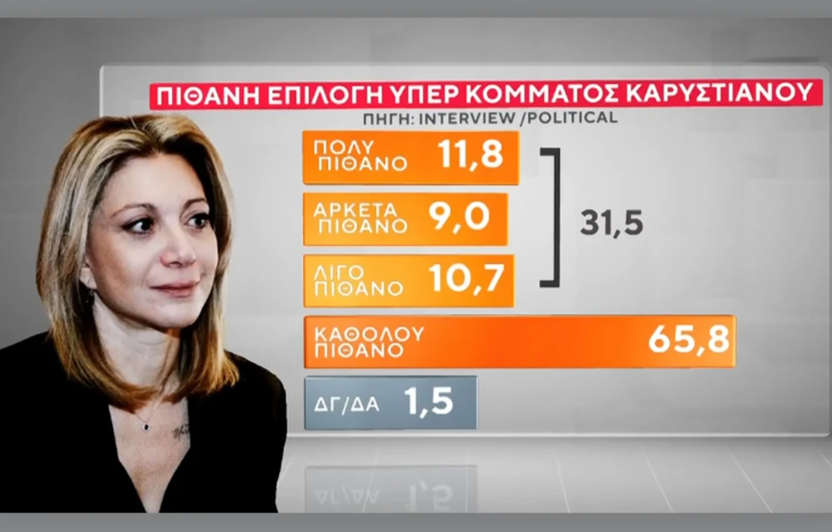 Στο ερώτημα κατά πόσο θα ψήφιζαν ένα κόμμα υπό την ηγεσία της Μαρίας Καρυστιανού, οι πολίτες απάντησαν: «πολύ πιθανό» σε ποσοστό 11,8%, «αρκετά πιθανό» 9%, «λίγο πιθανό» 10,7%, ενώ το 65,8% δηλώνει ότι δεν θα το ψήφιζε καθόλου.