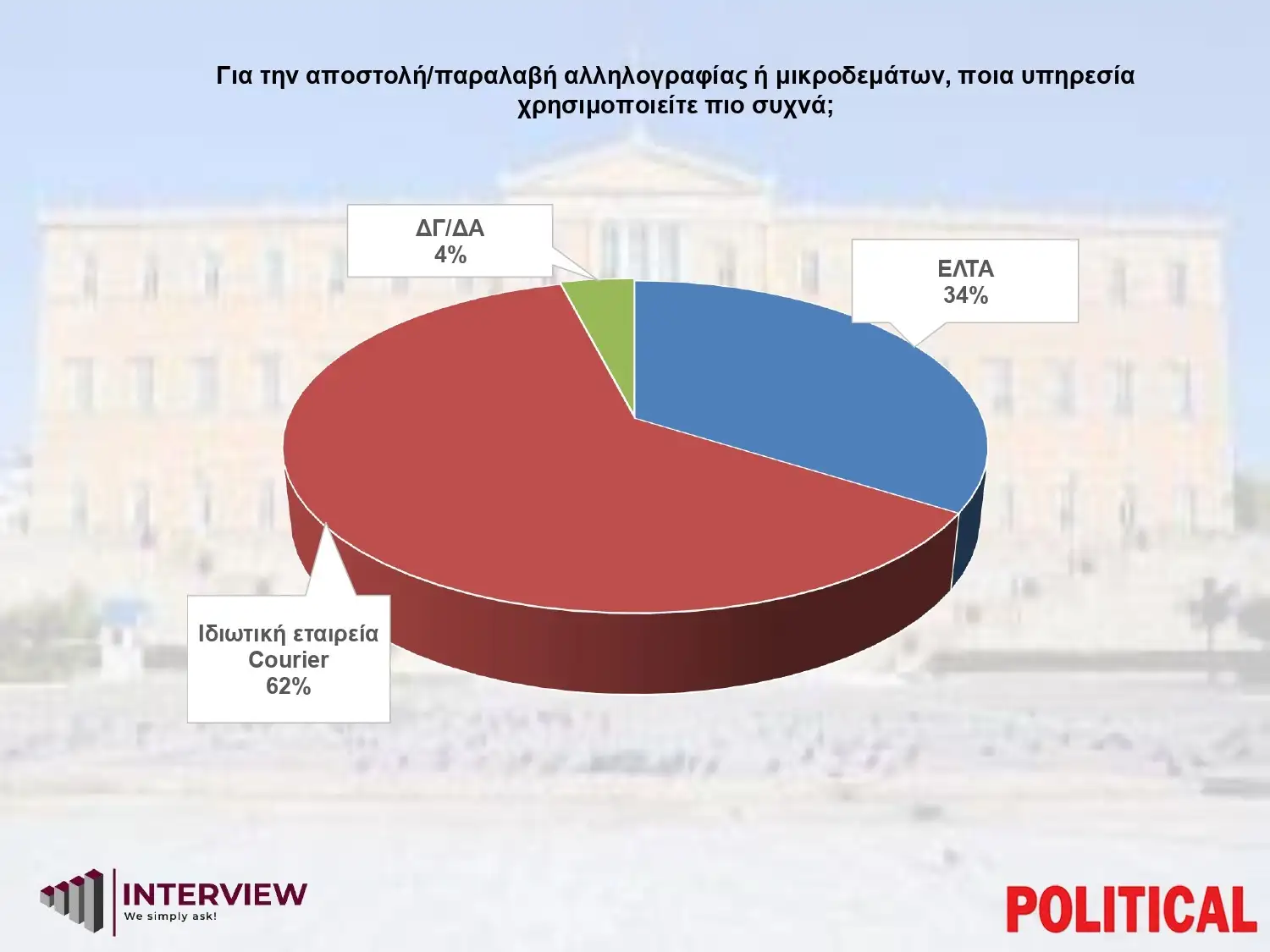 Τέλος, στη δημοσκόπηση της Interview έγινε ερώτηση και για την υπόθεση των ΕΛΤΑ με το 62% να απαντά ότι προτιμά τις ιδιωτικές εταιρείες courier για αποστολή/παραλαβή αλληλογραφίας ή μικροδεμάτων, έναντι 34% που επιλέγει τα ΕΛΤΑ και 4% που απαντά ΔΞ/ΔΑ.