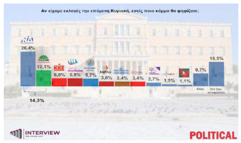 Ακολουθούν το ΠΑΣΟΚ με 12,1%, το ΚΚΕ με 6%, η Πλεύση Ελευθερίας με 5,9%, η Ελληνική Λύση με 5,7% και το ΜέΡΑ25 με 3,6%.